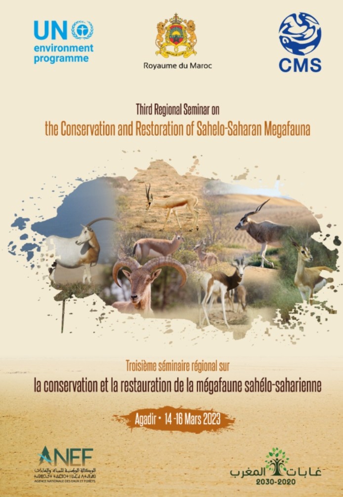 L’Agence Nationale des Eaux et Forêts (ANEF) organise, du 14 au 16 mars 2023 à Agadir, en collaboration avec le Secrétariat de la Convention des Nations Unies sur les espèces migratrices appartenant à la faune sauvage (CMS), le Troisième Séminaire Régional de haut niveau sur la Conservation et la Restauration de la Mégafaune Sahélo-saharienne.