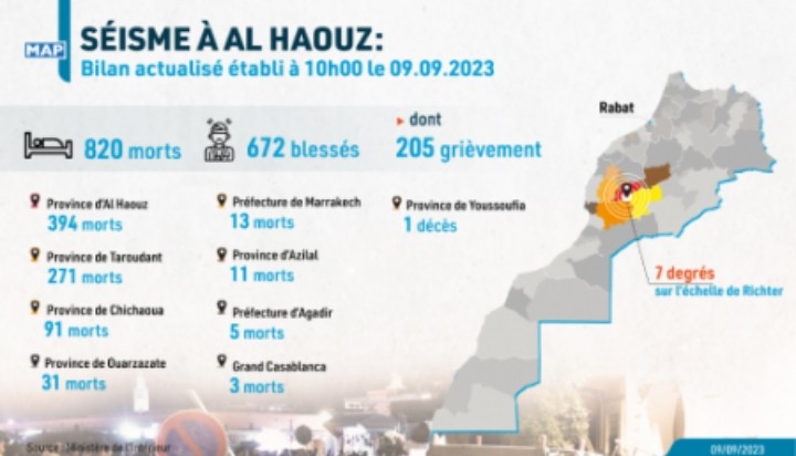 Le séisme, qui a frappé vendredi soir la province d’Al Haouz, a fait 820 morts et 672 blessés, dont 205 grièvement, selon un bilan actualisé du ministère de l’Intérieur, arrêté à 10h samedi.